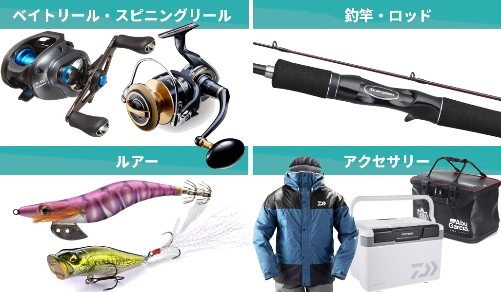 釣竿・ロッド、投げ竿、鮎竿、船竿、いかだ竿、リール、電動リール、ルアー、淡水用ルアー、海水用ルアー、玉網、道具箱、ルアーボックス、クーラーボックス、フィッシングウエア、ライフジャケット、魚群探知機など喜んで査定いたします。
